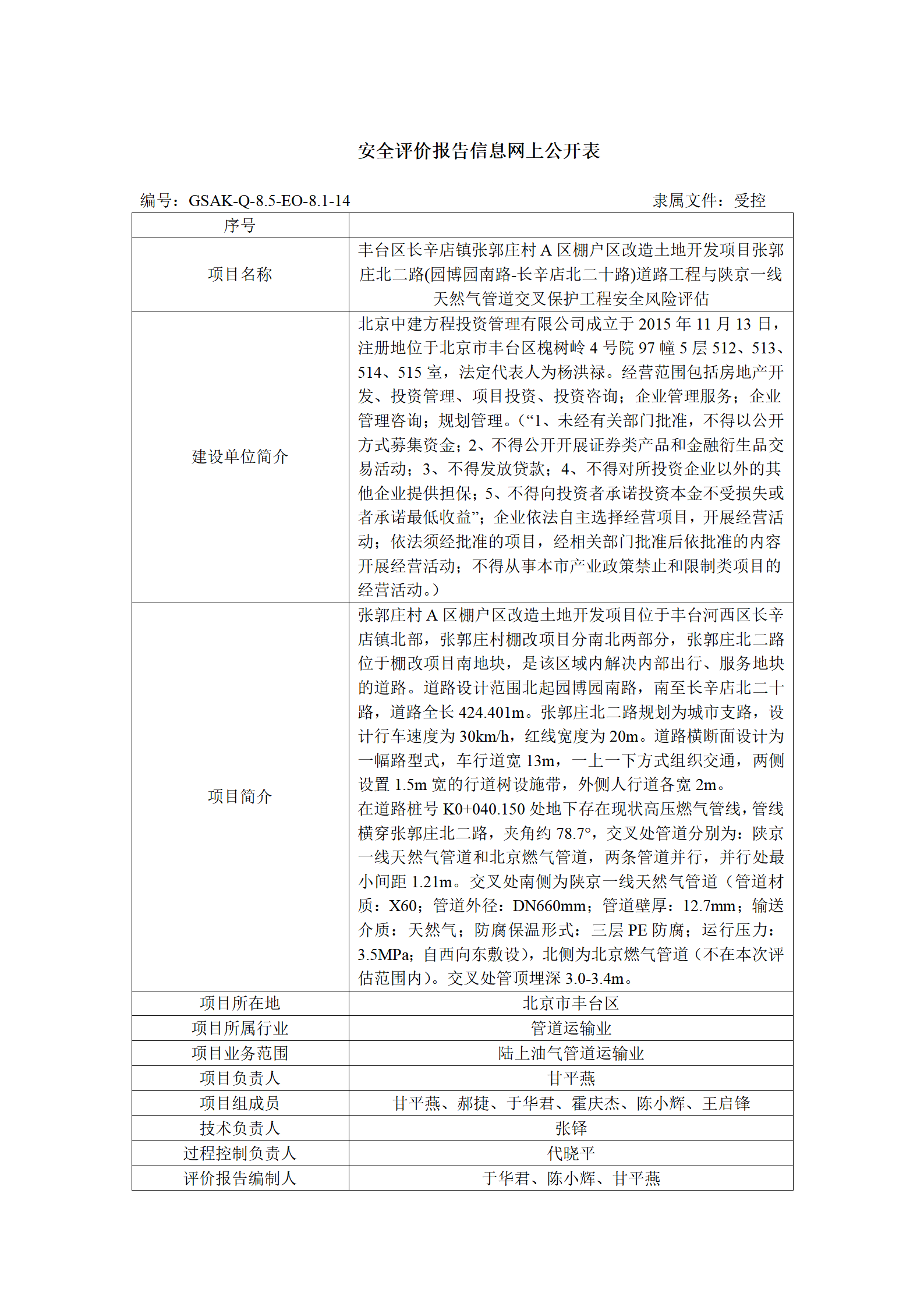 丰台区长辛店镇张郭庄村A区棚户区改造土地开发项目张郭庄北二路(园博园南路-长辛店北二十路)道路工程与陕京一线天然气管道交叉保护工程安全风险评估