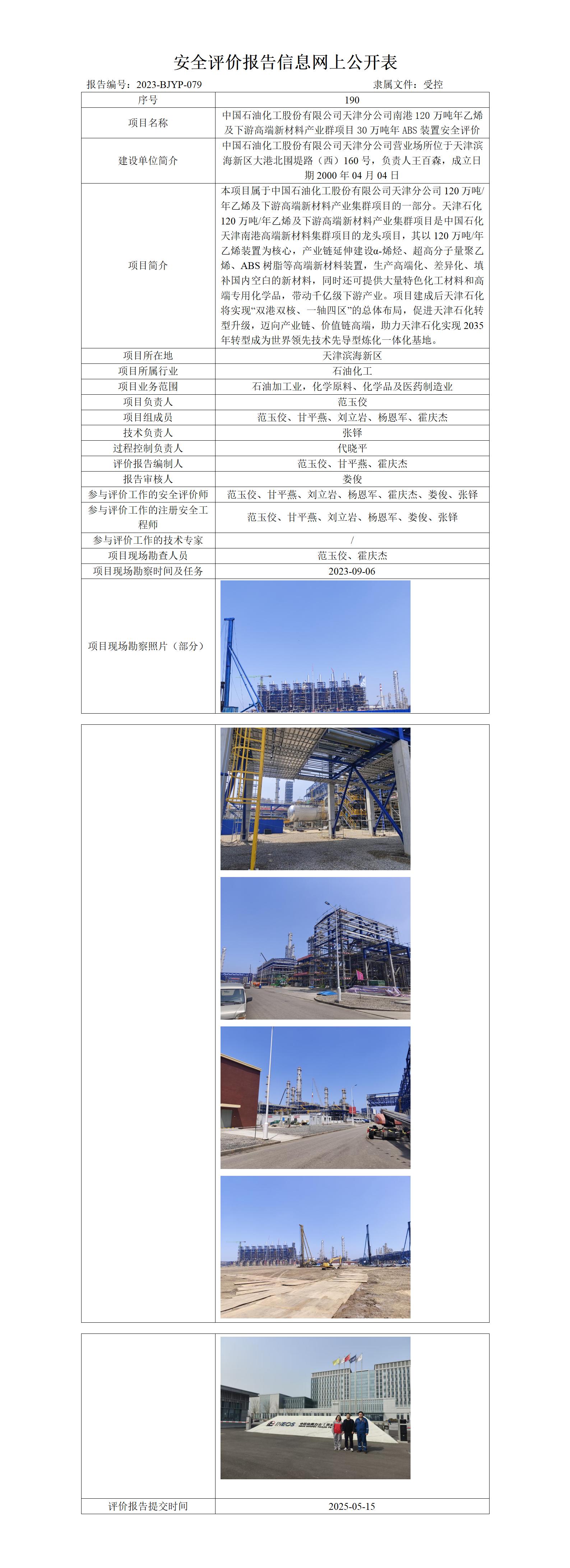 中国石油化工股份有限公司天津分公司南港120万吨年乙烯及下游高端新材料产业群项目30万吨年ABS装置安全评价
