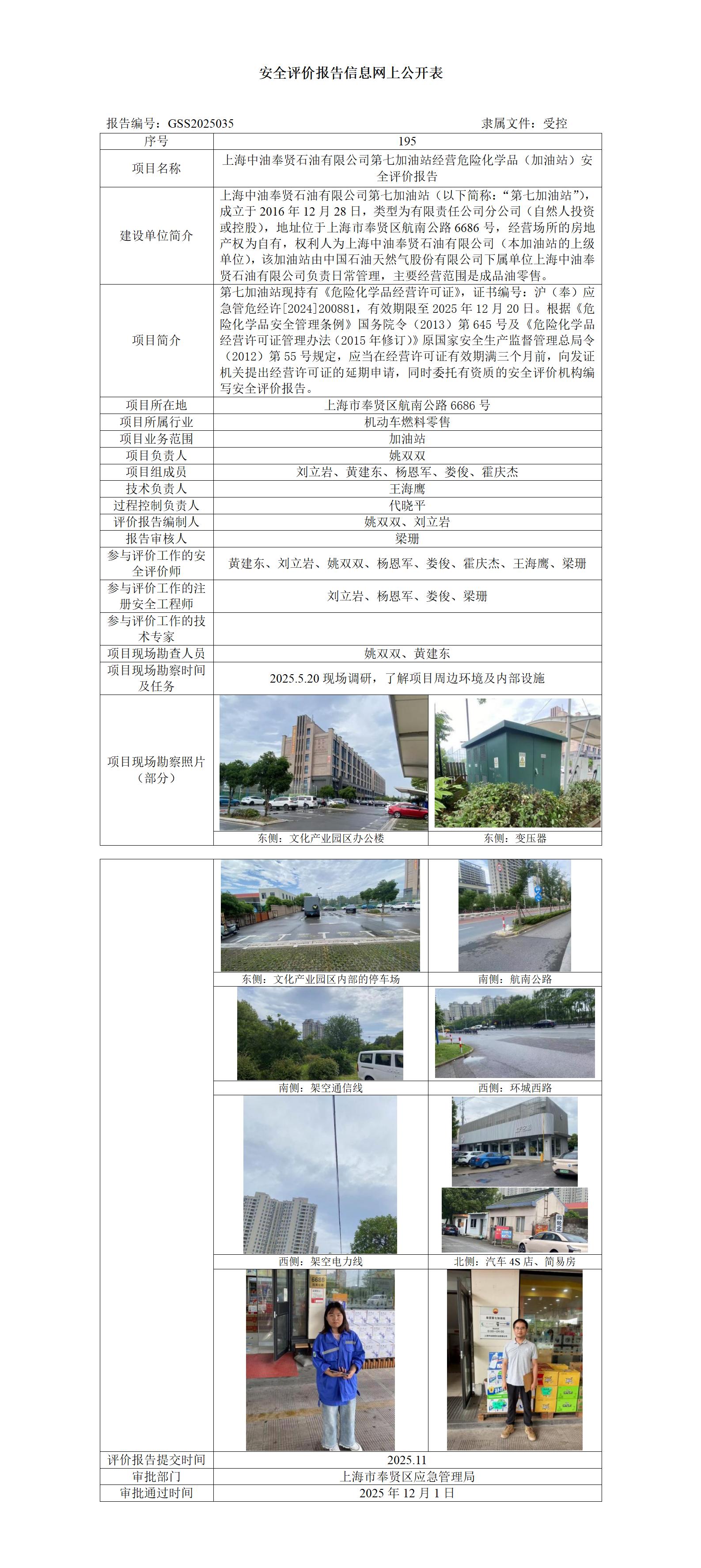 上海中油奉贤石油有限公司第七加油站经营危险化学品(加油站)安全评价报告