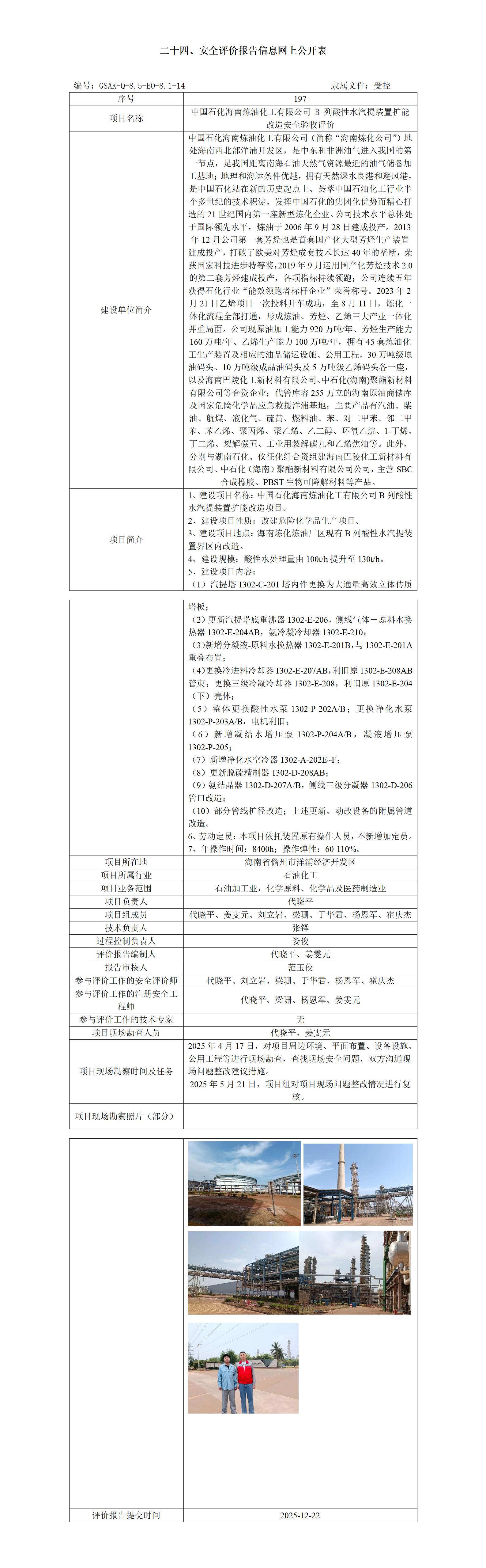 中国石化海南炼油化工有限公司 B 列酸性水汽提装置扩能改造安全验收评价