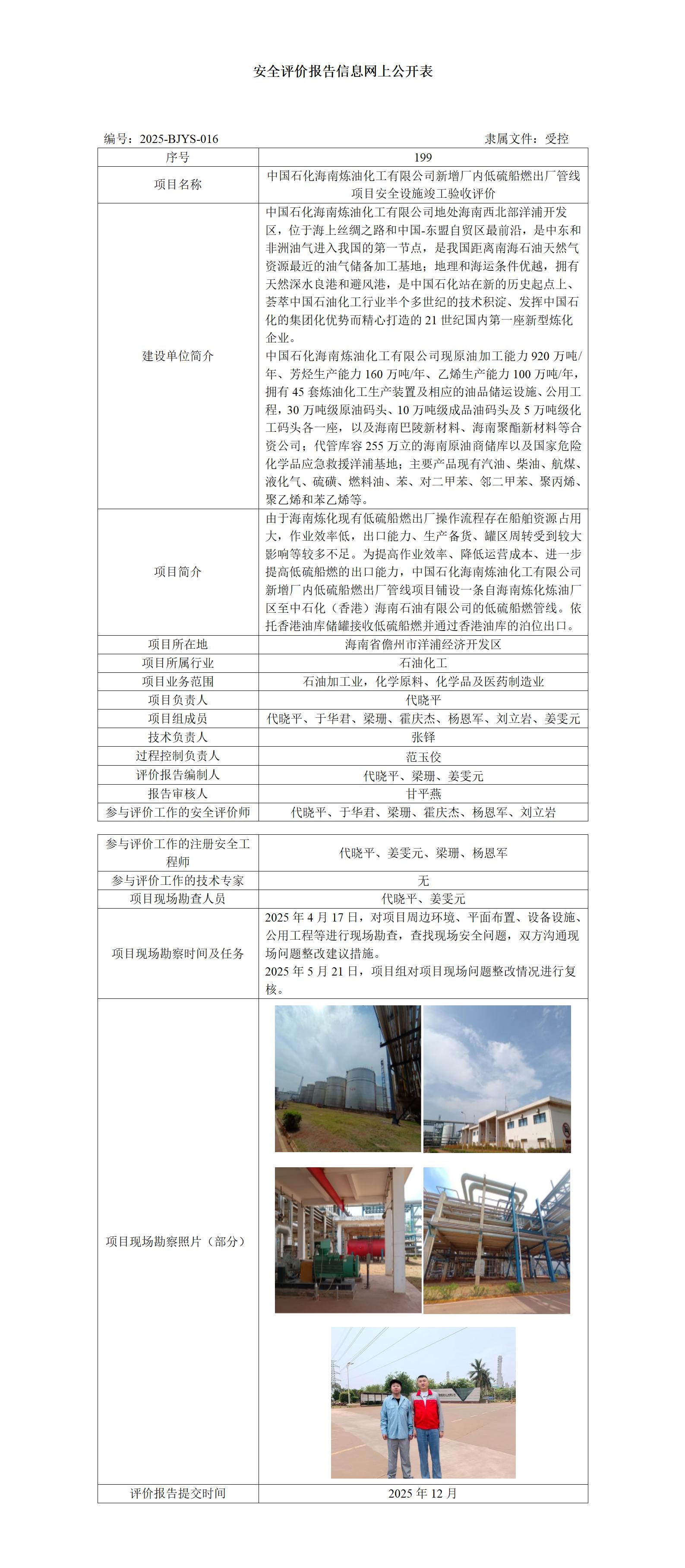 中国石化海南炼油化工有限公司新增厂内低硫船燃出厂管线项目安全设施竣工验收评价