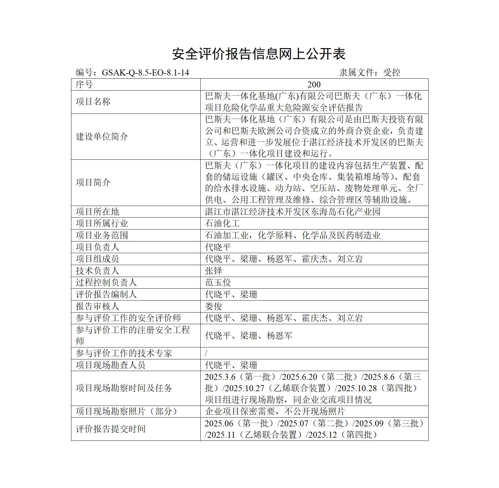 巴斯夫一体化基地(广东)有限公司巴斯夫(广东)一体化项目危险化学品重大危险源安全评估报告