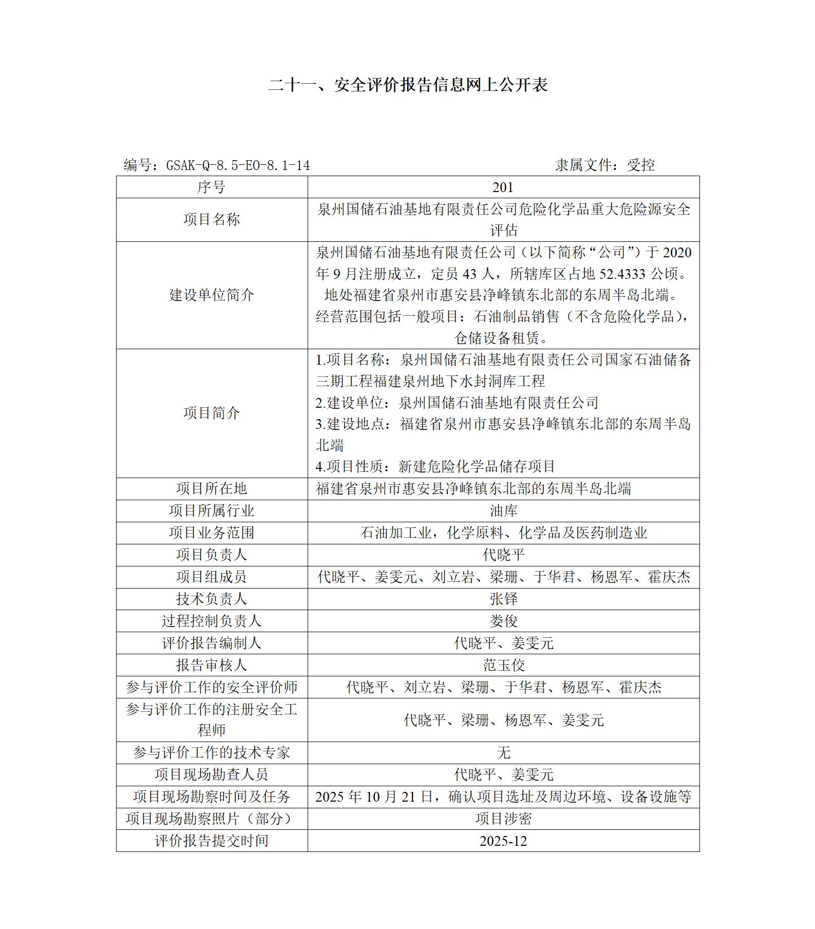 泉州国储石油基地有限责任公司危险化学品重大危险源安全评估