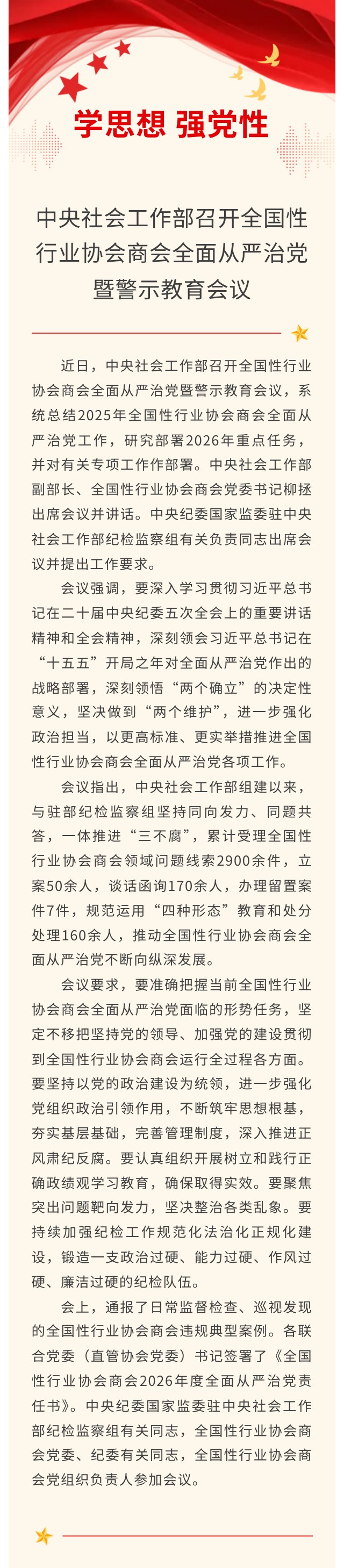 中央社会工作部召开全国性行业协会商会全面从严治党暨警示教育会议