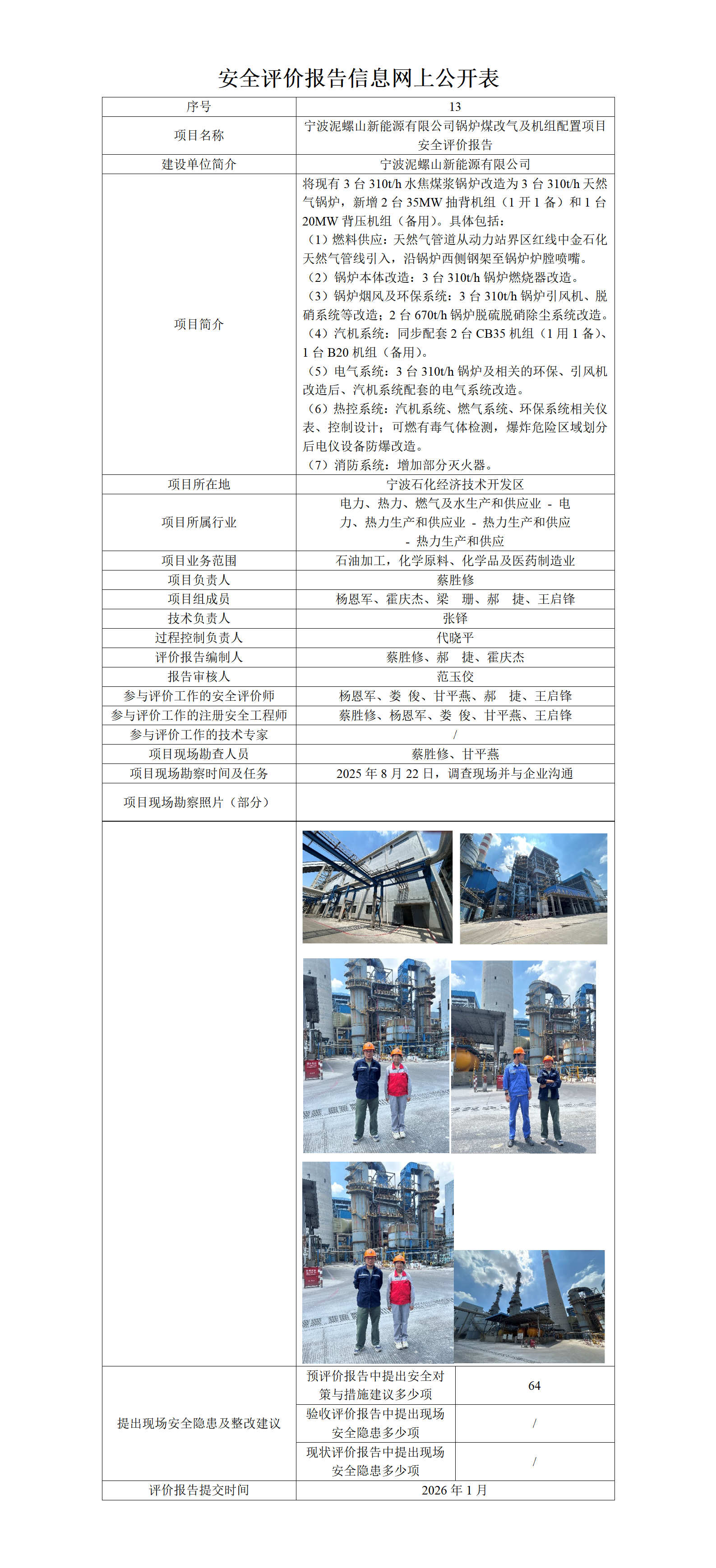 宁波泥螺山新能源有限公司锅炉煤改气及机组配置项目安全评价报告